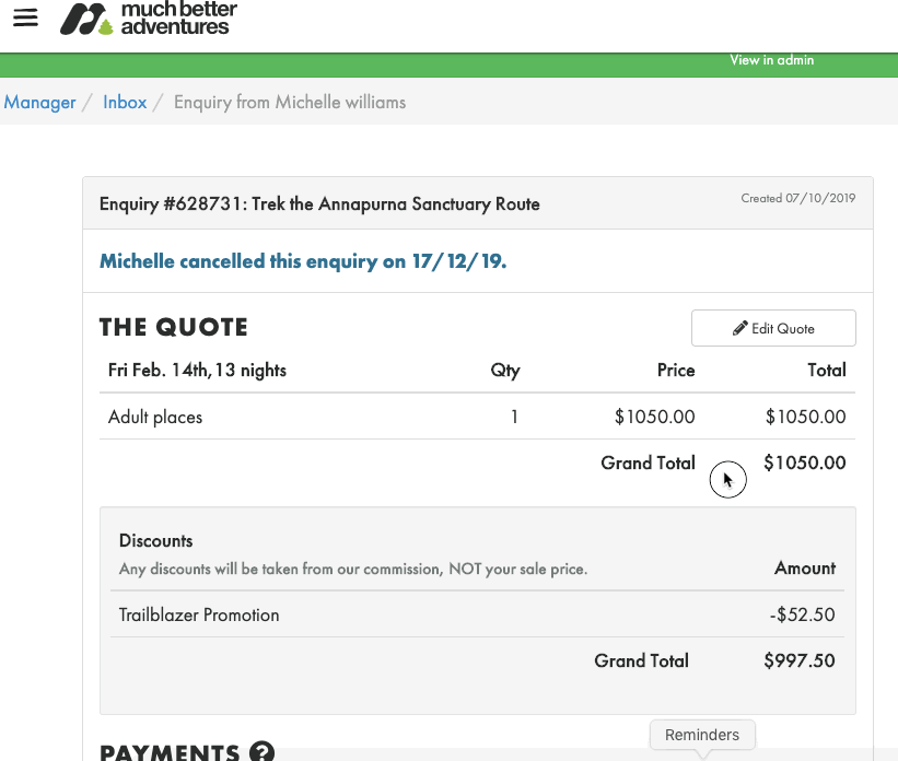 All you need to do then is select "Save Quote" and this will update the enquiry. The payment for the extra will be due once the full balance payment is due.