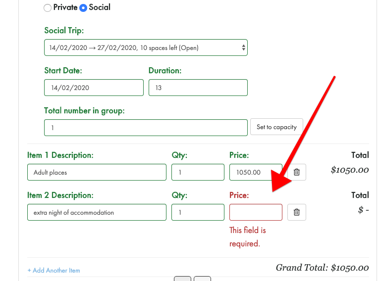 Quoting for things like extra nights and private room upgrades