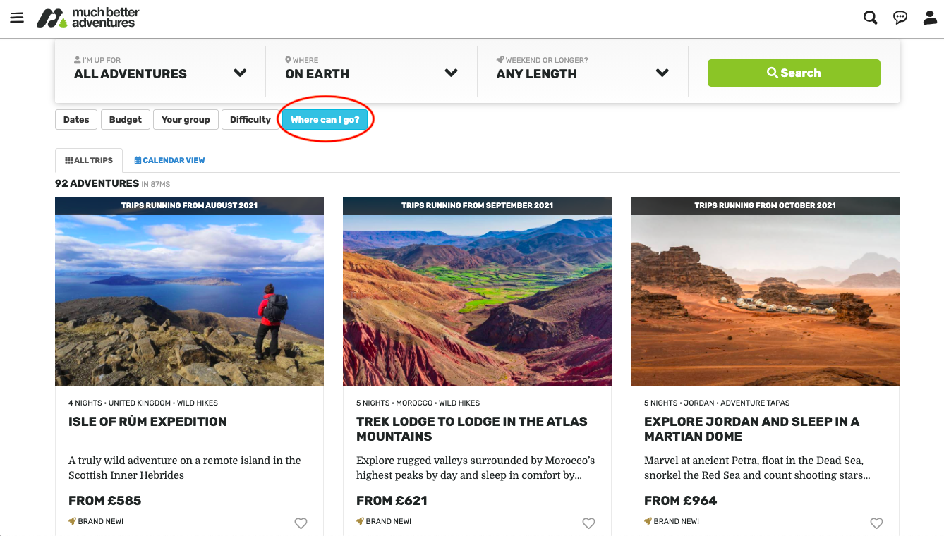 To make your life as easy as possible, we have added a new filter to our adventure search results: ‘Where can I go?’
