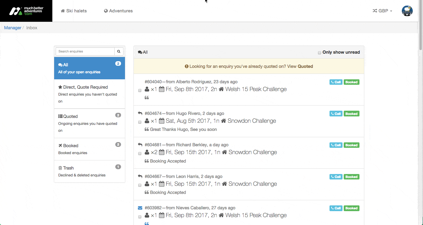 Search for the customer, using their enquiry ID, name or the product name, or select the enquiry from the list displayed.